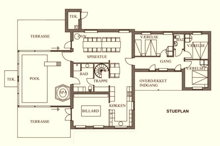 Eine Jagd im dazugehörigen Wald oder einfach nur ein Waldausflug mit der ganzen Familie können den Urlaub hier abrunden. Dieses Poolhaus mit 95.000 m² Wald- und Heidefläche liegt in einem unglaublich schönen Naturgebiet. Vom Wohnzimmer oben im 1. Stock genießen Sie wunderbare Aussicht durch die Panoramafenster. Das 290 m² große Poolhaus wurde 1996 erbaut und 2022 renoviert. Es liegt ca. 20 km südlich der Messestadt Herning. Im Poolraum können Sie sich im 20 m² großen Pool mit Wasserrutsche oder im 7-Personen-Whirlpool vergnügen. Das Haus verfügt über 2 Badezimmer mit Toilette, Waschbecken und Dusche und 1 Gästetoilette. Die Terrasse ist mit Gartenmöbeln und einem Grill ausgestattet. Für die Kinder gibt es Schaukeln, einen Sandkasten, eine Spielburg und einen kleinen Fußballplatz. Für die Wärme im Haus sorgen die Wärmepumpe und der knisternde Holzofen. Das Poolhaus bietet Platz für max. 20 Personen: 6 Zimmer mit einem Doppelbett, 1 Zimmer mit Doppelbett und Etagenbett, dazu 1 Zimmer mit 1 Doppelbett und 2 Einzelbetten. Max. 2 Haustiere sind erlaubt. Im Haus gibt es kein Pay TV. DAS RAUCHEN IST IM HAUS UNTERSAGT. KEINE VERMIETUNG AN JUGENDGRUPPEN.Kurz vor Ihrem Ankunftsdatum kann eine rückzahlbare Kaution erhoben werden. Die Kaution stellt sicher, dass Ihr Aufenthalt reibungslos verläuft, und deckt eventuelle Zusatzleistungen oder Verbrauchskosten ab.Diese Kaution deckt den Verbrauch von Nebenkosten während Ihres Aufenthalts sowie zusätzliche in Anspruch genommene Leistungen ab.Der endgültige Betrag wird anhand der tatsächlichen Zählerstände und Nutzung zusätzlicher Services angepasst. Ein etwaiger Restbetrag wird Ihnen innerhalb von 21 Tagen nach dem Check-out zurückerstattet.Die Kaution dient lediglich als Vorauszahlung für Leistungen, die Sie ohnehin bezahlen würden, und ermöglicht einen reibungslosen Ablauf Ihres Aufenthalts und Check-outs.