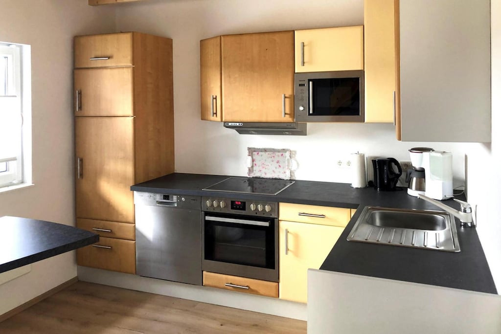 Kochplatte (4 Kochplatten, Ceranfeld), Wasserkocher, Toaster, Kaffeemaschine, Mikrowelle, Spülmaschine, Kühl-/Gefrierkombination