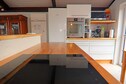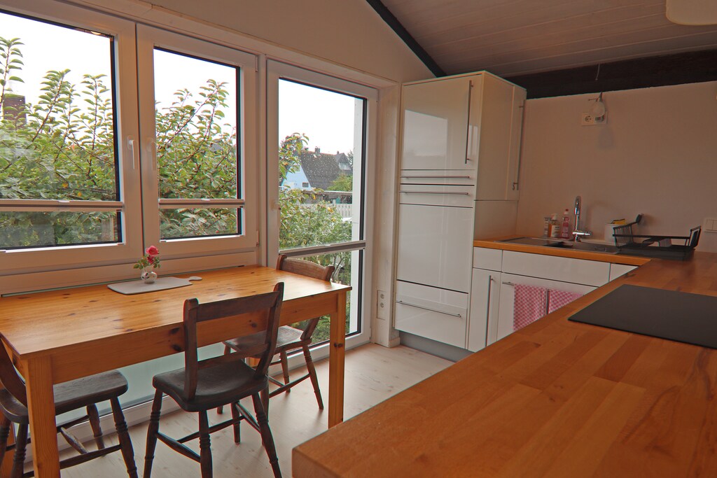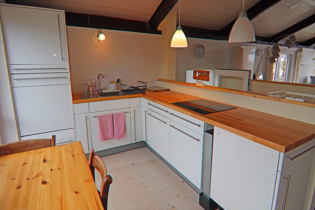 Esstisch, Kochplatte (Induktion, 4 Kochplatten), Wasserkocher, Toaster, Dunstabzugshaube, Kaffeemaschine, Backofen, Mikrowelle, Spülmaschine, Kühlschrank (+ Gefrierfach)