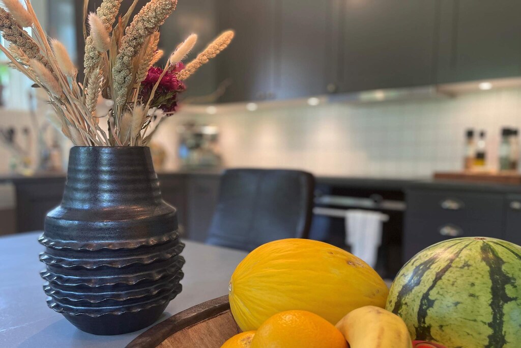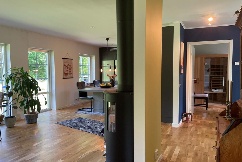 Willkommen in Klövedal! Ein wunderschönes Naturgebiet mit der Kulturlandschaft von Pilane an der Westseite des Tjörn. Acht Hektar Naturfläche mit Kunstwerken unter freiem Himmel. Hier weiden Schafe frei und halten die Landschaft offen. Besichtigen Sie Feuersteinsteine sowie Steingruppen aus der Eisenzeit. Das Ferienhaus liegt nur wenige hundert Meter von Pilane entfernt. Von hier aus können Sie bequem wandern, Rad fahren und Ausflüge unternehmen, beispielsweise nach Kyrkesund, Härön und in die umliegenden Orte wie Rönnäng und Skärhamn. Der Eingang befindet sich an der Vorderseite und führt in eine geräumige Diele mit viel Stauraum. Es gibt zwei Schlafzimmer; eines mit einem 140 cm breiten Bett, das zweite mit einem Etagenbett (unten 120 cm, oben 80 cm breite Liegefläche). In diesem Zimmer befindet sich auch eine schöne Infrarotsauna für zwei Personen sowie ein kleiner Fitnessraum für alle, die auch im Urlaub trainieren möchten. Es gibt eine offene Küche mit Essbereich und Blick sowohl zur kurzen Seite als auch zur Rückseite des Hauses. Geräumiges Wohnzimmer mit großem 65-Zoll-Fernseher, Sofa und Sessel sowie großen, schönen Fenstern nach hinten. Die Küche ist komplett ausgestattet mit Geschirrspüler, Mikrowelle, Wasserkocher, Kaffeemaschine, Herd, Kühlschrank und Hochstuhl. Das Haus verfügt über ein geräumiges Badezimmer mit WC, Waschbecken, Dusche, Waschmaschine und Trockner. Wickelfläche über der Waschmaschine (bitte bringen Sie eine eigene Wickelauflage mit.) Genießen Sie den Sommer auf einer außergewöhnlichen Terrasse! Eine große Holzterrasse erstreckt sich entlang der Rückseite und des Giebels des Hauses und bietet mehrere gemütliche Sitzgruppen, eine Kaffeeecke, einen Esstisch, Lounge-Ecken, Sonnenliegen und Sonnenschirme. Perfekt für Sonne und Schatten, den Morgenkaffee oder ein entspanntes Beisammensein am Abend. Es gibt ein Trampolin, ein Fußballtor und eine große Rasenfläche zum Spielen. Für alle, die gerne draußen essen, stehen ein Grill und ein Holzkohlegrill bereit. Wenn Sie Lust auf ein Abenteuer haben, können Sie kostenlos vier einfache Fahrräder für Erwachsene und ein Seekajak ausleihen. Die nächste Einkaufsmöglichkeit befindet sich in Kållekärr (6 km) oder die Stadt Skärhamn mit ihren zahlreichen Geschäften, Restaurants und dem bekannten Nordischen Aquarellmuseum sind ebenfalls schnell zu erreichen. Nutzen Sie die Gelegenheit und erkunden Sie die Schären und die kleinen Fischerdörfer rund um Tjörn, wie Klädesholmen und Kyrkesund. Alternativ können Sie mit der Fähre von Rönnäng zu den nahegelegenen autofreien Inseln Åstol, Dyrön und Tjörnekalv übersetzen. Göteborg mit dem bekannten Freizeitpark Liseberg erreichen Sie in 60 Minuten mit dem Auto. Das Haus kann nicht von Jugendgruppen gebucht werden; mindestens eine ältere Aufsichtsperson ist während des gesamten Aufenthalts erforderlich. Genießen Sie die zauberhafte Natur und die Ruhe dieses idyllischen Ortes!