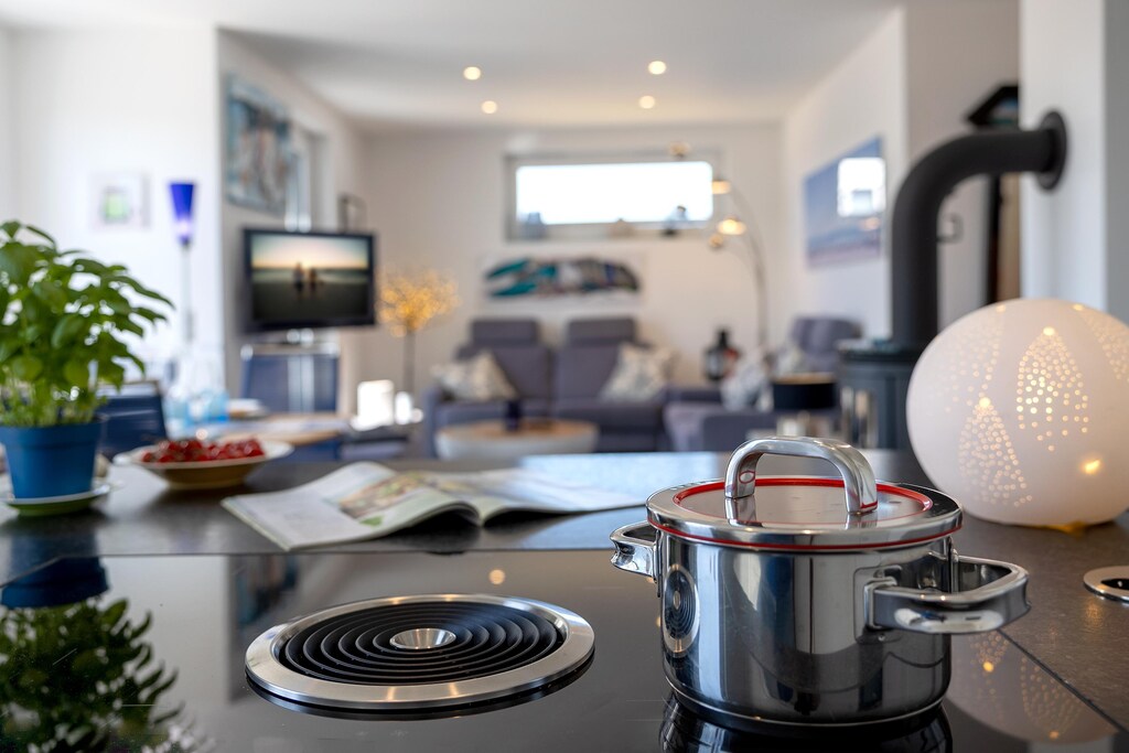 Kochplatte (Induktion, 4 Kochplatten), Wasserkocher, Toaster, Kochherd, Kaffeemaschine (cups), Backofen, Spülmaschine, Kühlschrank