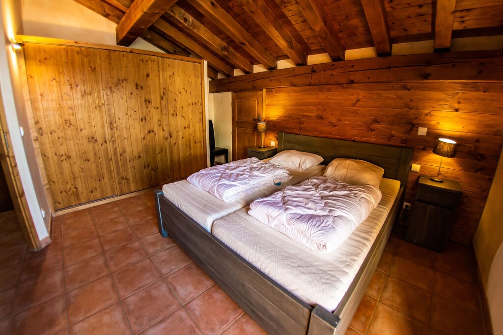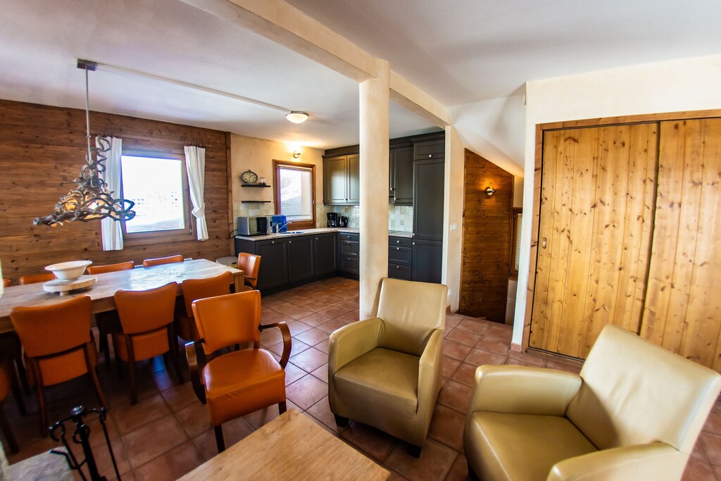 Eingebettet in die Nordalpen verbindet dieses charmante Chalet im Park Madeleine traditionelles Holz- und Steindesign mit modernem Komfort. Das Wohnzimmer bietet Platz für 6–12 Gäste und ist mit einem Holzofen ausgestattet, der nach dem Skifahren oder Wandern zum Entspannen einlädt. Die gut ausgestattete Küche mit Herd, Backofen, Geschirrspüler, Kühl-Gefrierkombination, Kaffeemaschine, Toaster und Wasserkocher ermöglicht gemütliche Familien- oder Gruppenessen. Genießen Sie auf dem Balkon oder der Terrasse mit Sitzgelegenheiten den Bergblick und die frische Alpenluft.
