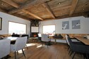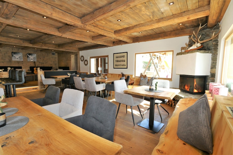 große Holzstube mit abgeteilt in mehrere Bereiche mit Esstischen, Bar mit Schankanlage (Bierfass und Getränke können vor Ort gekauft werden) und gemütlichen Kamin.