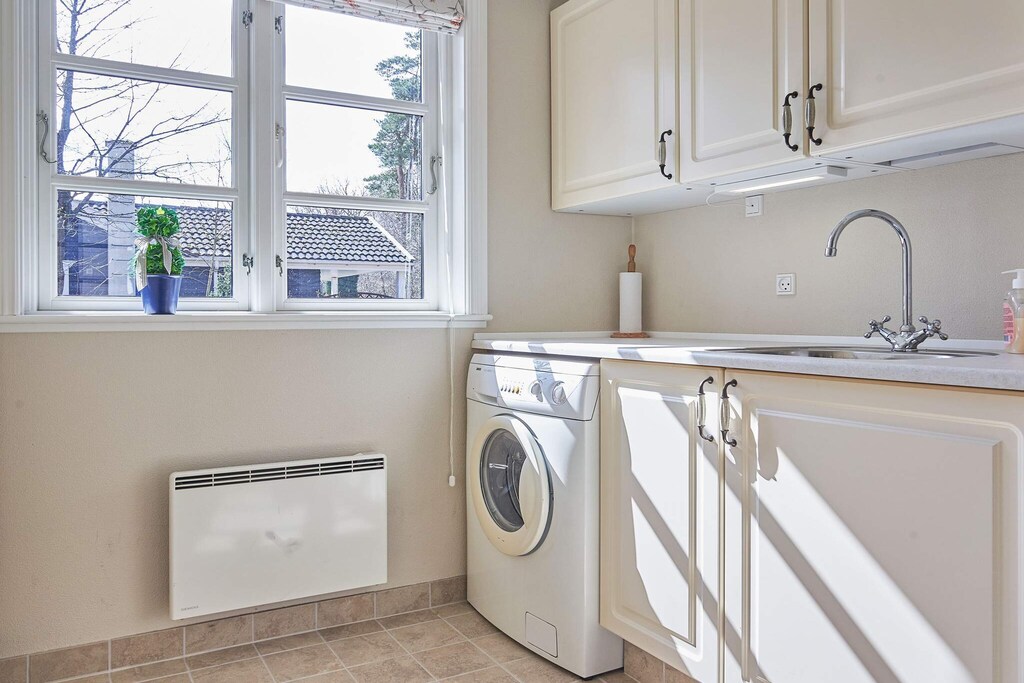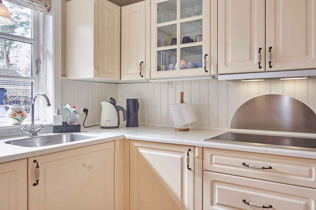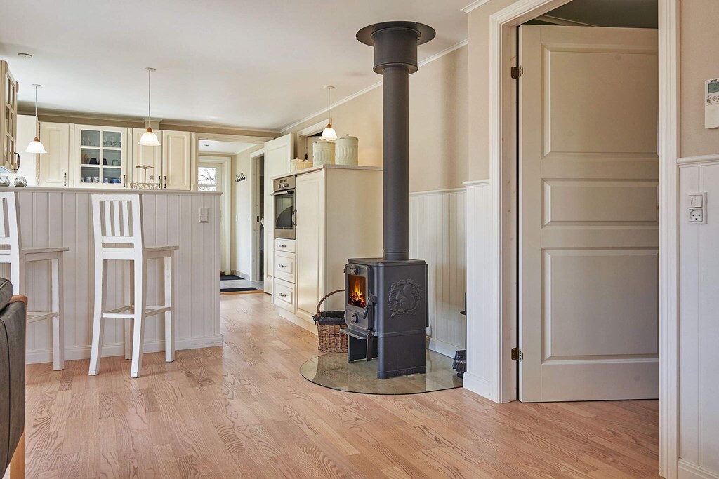 Dieses Ferienhaus liegt im ruhigen Ferienhausgebiet Sorthat-Muleby, nur wenige Schritte vom schönen Strand von Sorthat Rev entfernt. Auf dem Weg dorthin durchqueren Sie den Wald, wo Sie auf kleine künstliche Seen und Spuren aus der Zeit stoßen, als in der Gegend einst Kohle und Ton abgebaut wurden. Das Haus verfügt über einen praktischen Eingangsbereich und einen Hauswirtschaftsraum mit Spüle und Waschmaschine. Von hier aus haben Sie Zugang zu einem Badezimmer mit Whirlpool – ideal zum Entspannen nach einem aktiven Tag. Der offene Küchen- und Wohnbereich ist das Herzstück des Hauses und bietet eine helle, gut ausgestattete Küche, eine Essecke und eine gemütliche Sitzecke. Ein Holzofen und eine energieeffiziente Wärmepumpe sorgen für wohlige Wärme, während die großen Fenster die umliegende Natur genießen lassen. Vom Wohnzimmer aus gibt es zwei Ausgänge zur großzügigen Terrasse, die das gesamte Haus umgibt. Dank ihrer Gestaltung können Sie jederzeit zwischen Sonne und Schatten wählen. Die Terrasse ist mit einer Außendusche und einem stilvollen Außenkamin ausgestattet und lädt zum Entspannen ein. Auf dem Grundstück befindet sich außerdem eine Feuerstelle für gemütliche Abende unter freiem Himmel. Ein Parkplatz ist auf dem Grundstück vorhanden. Bitte beachten: Die Vermietung an Jugendgruppen ist nicht gestattet.
