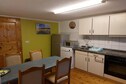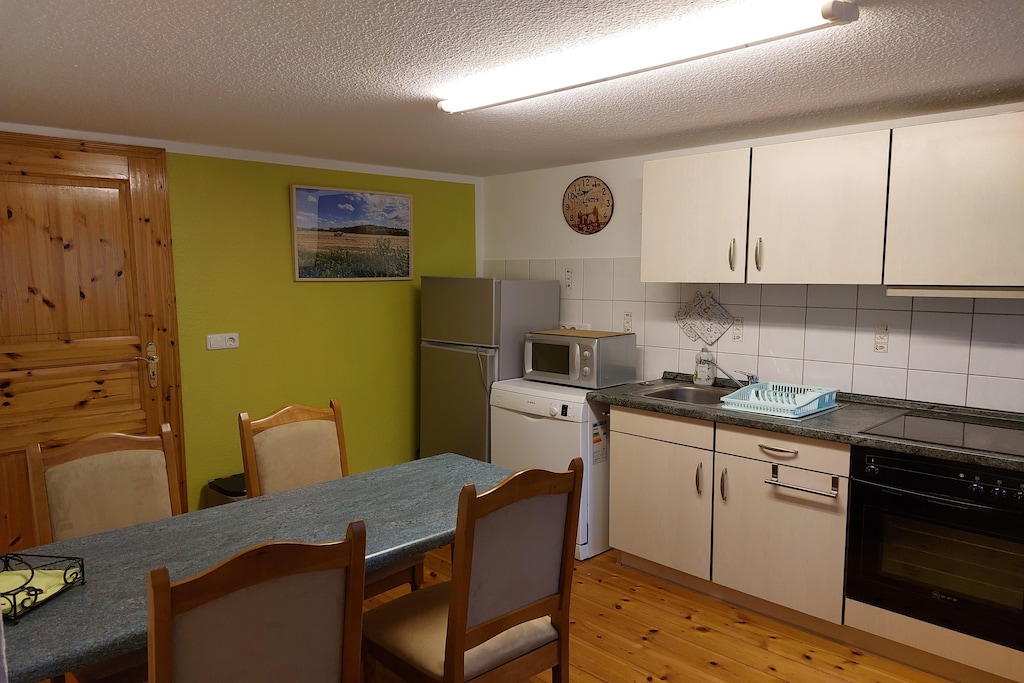 Esstisch, Kochplatte (Ceranfeld, 4 Kochplatten), Wasserkocher, Toaster, Kaffeemaschine, Backofen, Mikrowelle, Spülmaschine, Kühl-/Gefrierkombination