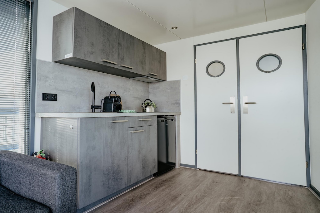 Willkommen zu Ihrem Rückzugsort am See! Diese moderne und stilvolle Hafenlodge liegt an einem der ruhigsten Plätze des Yachthafens und bietet einen freien Blick auf das glitzernde Uitgeestermeer. Das durchdachte und komfortable Design bietet ein gemütliches Wohnzimmer, Fußbodenheizung, eine voll ausgestattete Küche mit Kaffeemaschine und Kühlschrank sowie zwei ruhige Schlafzimmer – eines mit Doppelbett, das andere mit einem charmanten Etagenbett. Ob Sie bei Sonnenaufgang einen Kaffee trinken oder ein Abendessen im Freien genießen – die private Terrasse mit Gartenmöbeln macht jeden Moment zu etwas ganz Besonderem.