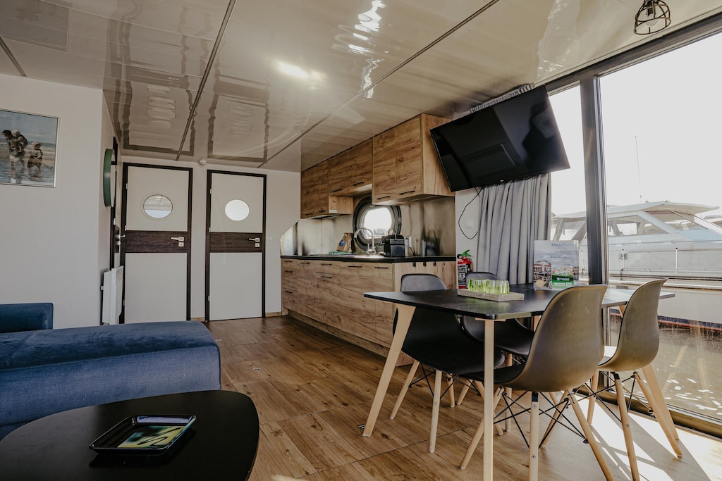 Erwachen Sie an Bord dieses wunderschön gestalteten Hausboots, das an einem der malerischsten Orte des Yachthafens liegt, mit glitzerndem Wasser und unvergleichlicher Ruhe. Es besticht durch seinen maritimen Stil und modernen Komfort und bietet einen gemütlichen Wohnbereich mit TV, eine offene Küche mit Kaffeemaschine und Kühlschrank, ein Schlafzimmer mit Doppelbett und ein zweites Schlafzimmer mit Einzelbett und Ausziehbett. Fußbodenheizung und elegante Möbel machen dieses schwimmende Refugium stilvoll und ruhig zugleich.
