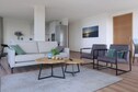 Das moderne Wohnzimmer des Sea Wave Panorama Apartments verfügt über eine gemütliche Sitzecke, in der Sie mit Ihrer Gesellschaft entspannen können. Es gibt einen Smart-TV mit Streaming-Option. Es gibt auch einen Essbereich und eine offene Küche, die komplett ausgestattet ist, einschließlich eines Stehtischs, eines Bora-Kochfelds, eines Kühl-Gefrierschranks, eines Kombiofens, einer Nespresso-Maschine und eines Geschirrspülers.