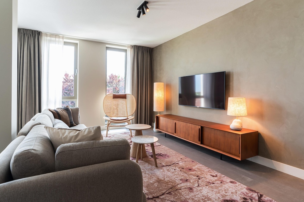 Diese geräumigen 2-Zimmer-Apartments mit jeweils 91 m² bieten eine großzügige Alternative zu den kleineren Einheiten und reichlich Platz für bis zu 4 Gäste. Sie eignen sich perfekt für kurze und längere Aufenthalte und bieten ein komfortables und stilvolles Ambiente. Beim Betreten werden Sie sofort von einer warmen und einladenden Atmosphäre begrüßt, die durch eine harmonische Kombination aus natürlichen Farben, Materialien und moderner Technologie geprägt ist und das Wohnerlebnis insgesamt verbessert.
