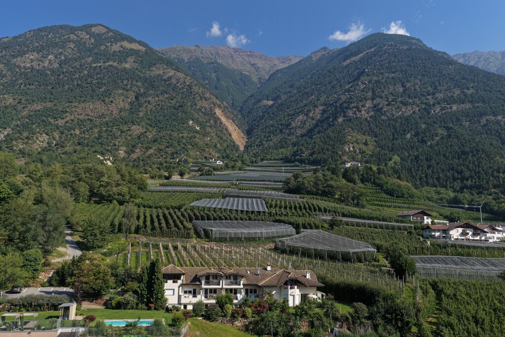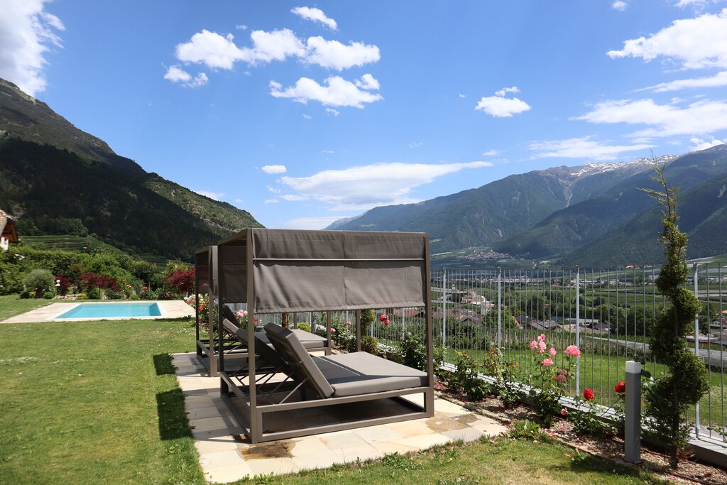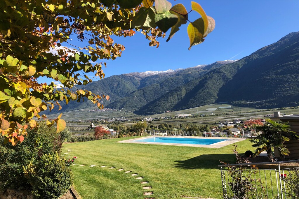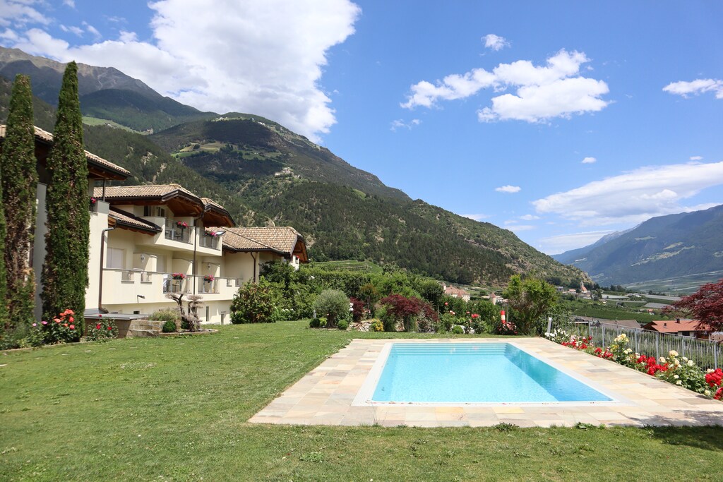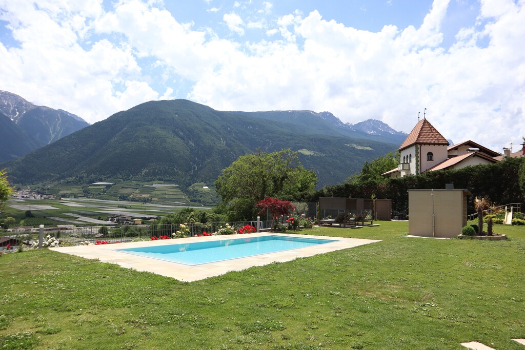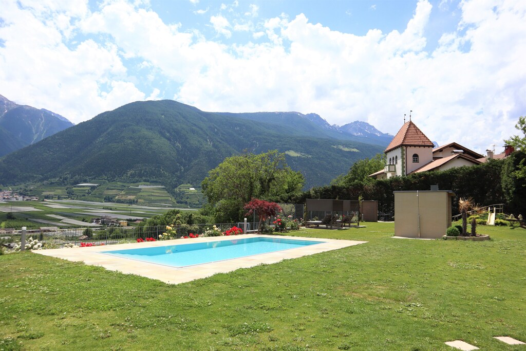 Reizendes Appartementhaus mit einem einladenden Poolbereich, umgeben von zahlreichen Obstplantagen und viel Grün. Sie befinden sich in einer ruhigen, sonnigen Lage unmittelbar am Ortseingang von Goldrain, einem 650 Meter hoch gelegenen Ortsteil von Latsch im Vinschgau. Umgeben von einer einzigartigen Berglandschaft können Sie im Pool entspannen und gleichzeitig die atemberaubende Sicht hinab auf das Tal genießen. Für Entspannung sorgen die Erlebnisduschen und der Relaxbereich. Während die kleinen Gäste auf dem Spielplatz toben können, erholen Sie sich in der Sauna (gg. Gebühr) oder auf einer der Liegen mit spannender Lektüre. Die Residence Lahnhof hat einen registrierten Landeplatz für Hubschrauber, auf dem die Landung nach Anfrage mit eigenem Hubschrauber möglich ist.