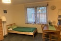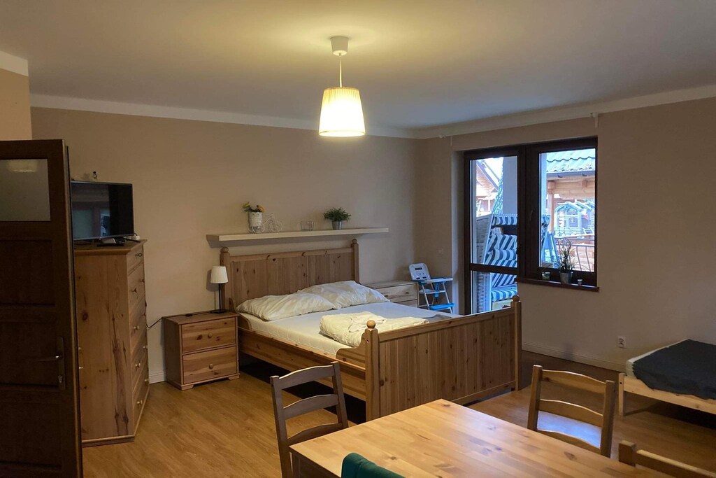 Gemütliche Apartments für 4 Personen befinden sich im Erdgeschoss eines kleinen Gebäudes, in dem sich auch die Rezeption des Freizeitzentrums befindet. Die Wohnung besteht aus einem großen Raum, der sowohl als Wohnzimmer als auch als Schlafzimmer dient. Es gibt ein großes Doppelbett und 2 Einzelbetten. Es gibt einen Tisch mit Stühlen und einen Fernseher. Der Raum ist mit der Küche verbunden. Es gibt ein Badezimmer mit Dusche. Fußbodenheizung. Die Wohnungen verfügen über Terrassen und direkte Ausgänge nach außen. Gartenmöbel und Liegestühle sind vorhanden. Den Gästen steht WLAN zur Verfügung.