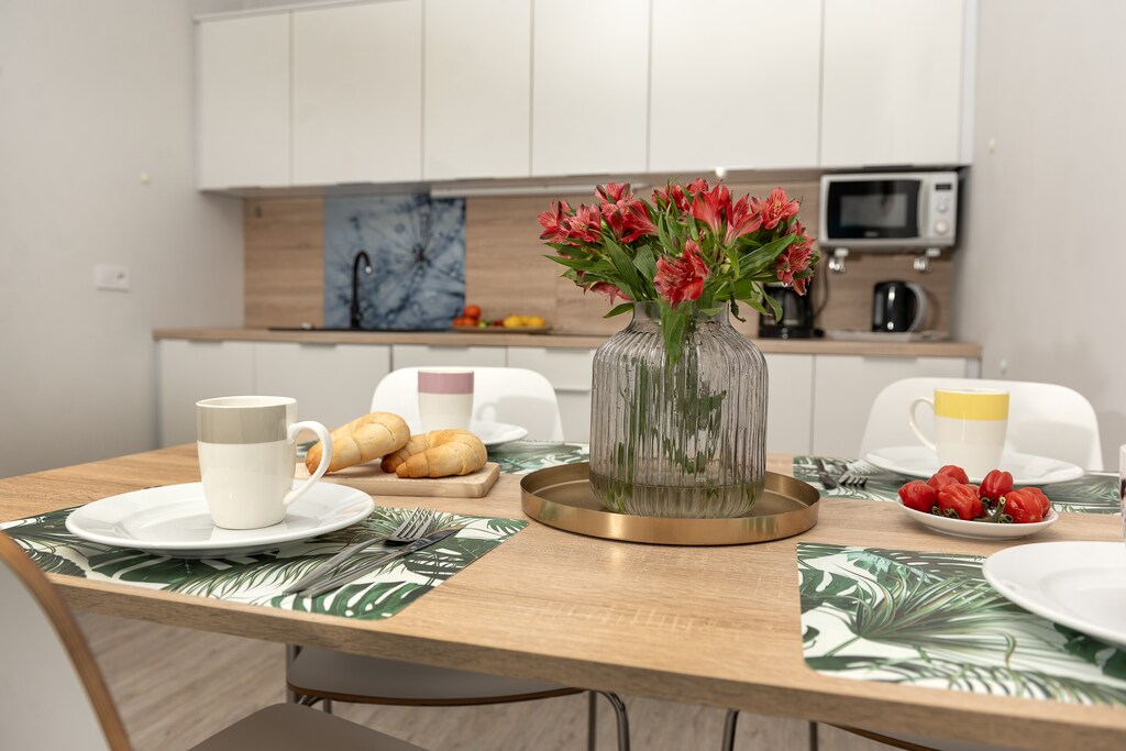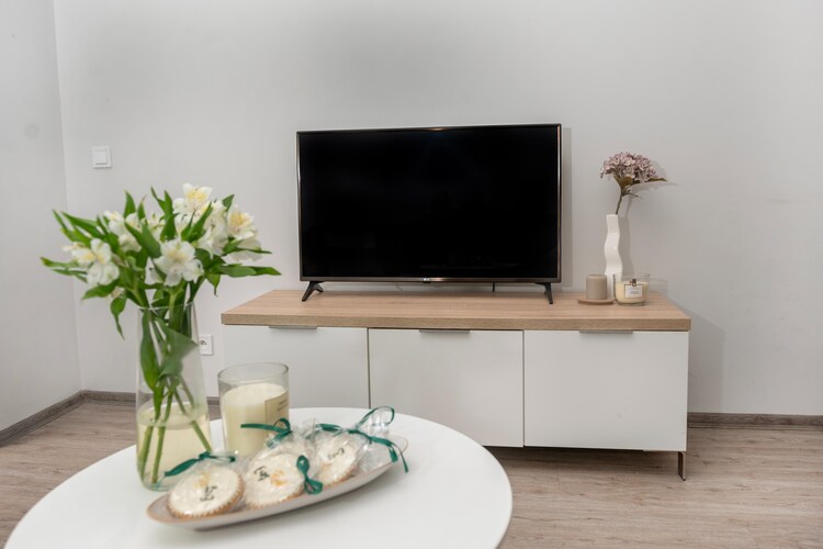 Im Erdgeschoss befindet sich eine gemütliche 2-Zimmer-Wohnung. Es besteht aus einem geräumigen Wohnzimmer, das mit der Küche verbunden ist, einem Schlafzimmer und einem Badezimmer mit Dusche (es gibt auch eine Waschmaschine). Die Küche ist perfekt ausgestattet. Das Wohnzimmer verfügt über einen Fernseher, einen Tisch mit Stühlen, ein 2-Sitzer-Sofa und einen 1-Sitzer-Sessel. Die Wohnung verfügt über eine sehr große Terrasse mit Gartenmöbeln. Zentralheizung. WLAN ist verfügbar.