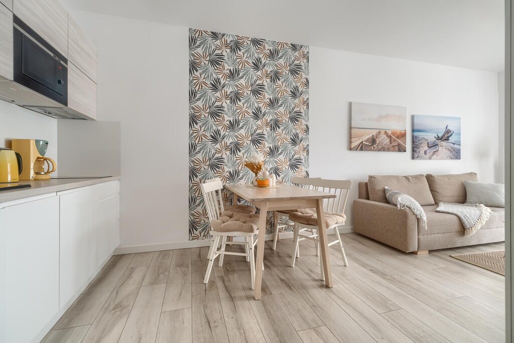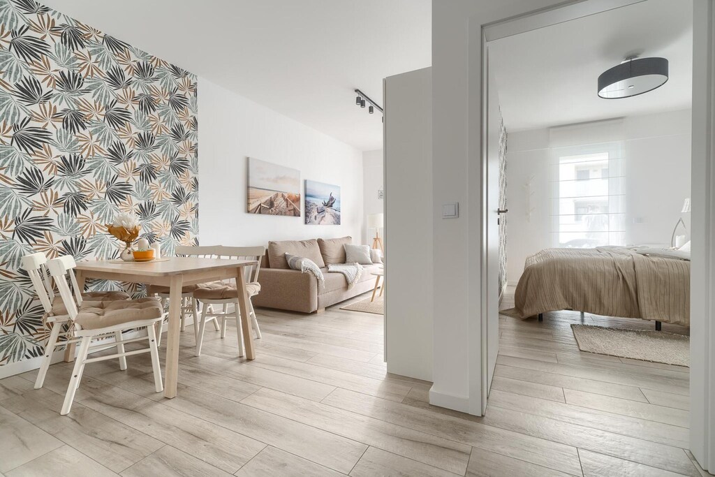 Eine komfortable Wohnung im ersten Stock des Gebäudes (es gibt einen Aufzug). Es besteht aus einem Wohnzimmer (ausziehbares Sofa, Tisch, TV), einer gut ausgestatteten Küche und einem Badezimmer mit Dusche. Das Schlafzimmer verfügt über ein breites und bequemes Doppelbett. Die Wohnung verfügt über einen großen Balkon mit Loungemöbeln. Zentralheizung. WLAN ist verfügbar. Den Gästen stehen kostenfreie Parkplätze in der Tiefgarage zur Verfügung.