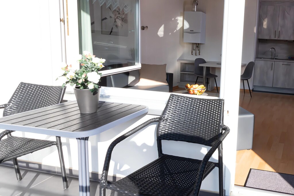 Das Apartment verfügt über ein helles Wohnzimmer mit Klimaanlage und eine private Terrasse, die zum Essen im Freien oder Entspannen in der Sonne möbliert ist. Die moderne Küche ist komplett ausgestattet mit Kaffeemaschine, Mikrowelle, Geschirrspüler, Trockner und Waschmaschine – ideal für längere Aufenthalte oder selbst gekochte Mahlzeiten.
