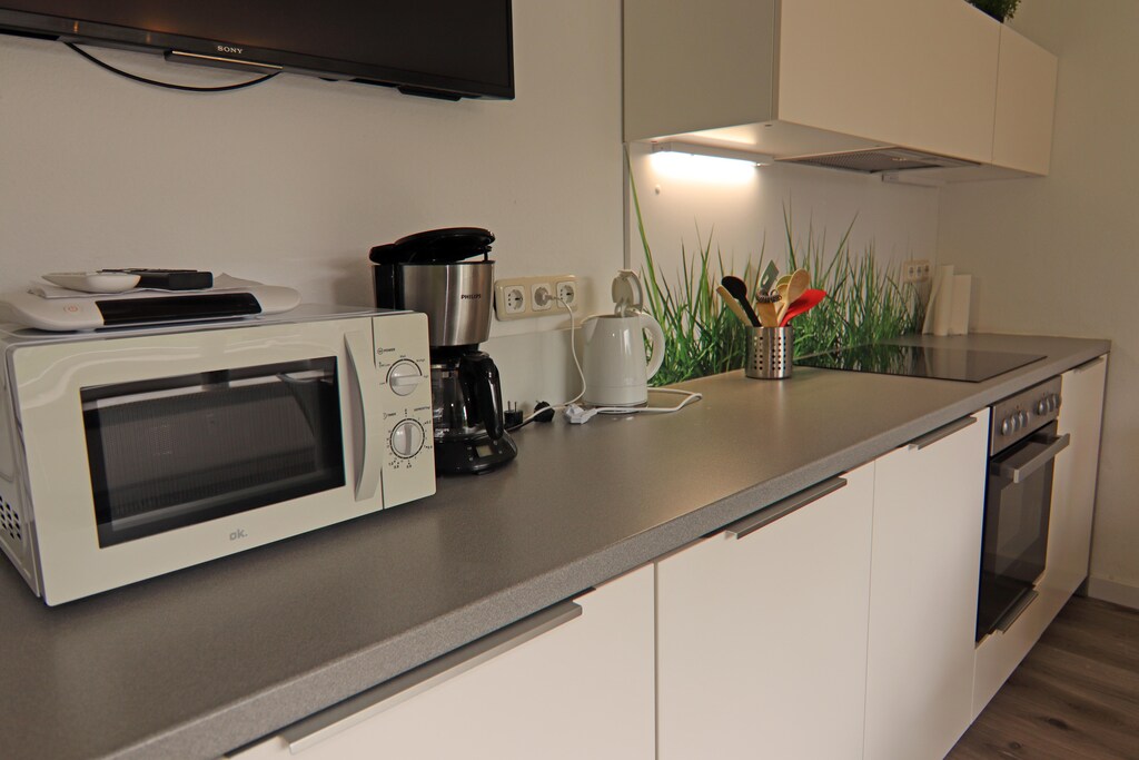 Esstisch, Herd, Kochplatte (Ceranfeld), Wasserkocher, Toaster, Kaffeemaschine, Backofen, Mikrowelle, Spülmaschine, Kühlschrank