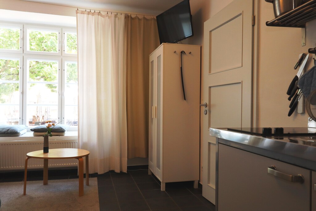 Willkommen in Ihrem charmanten Studio-Apartment im Herzen von Wismar, nur 100 Meter von der historischen Altstadt und einen kurzen Spaziergang vom malerischen Alten Hafen entfernt. Im Erdgeschoss eines traditionellen Hansehauses gelegen, bietet dieses Apartment einen gemütlichen und komfortablen Aufenthalt für zwei Personen. Es verfügt über einen hellen Wohnbereich mit Doppelschlafsofa, TV und WLAN sowie eine voll ausgestattete offene Küchenzeile. Genießen Sie Ihren Morgenkaffee im Sitzbereich direkt vor dem Apartment mit herrlichem Blick auf den Hafen und die vorbeifahrenden Boote.