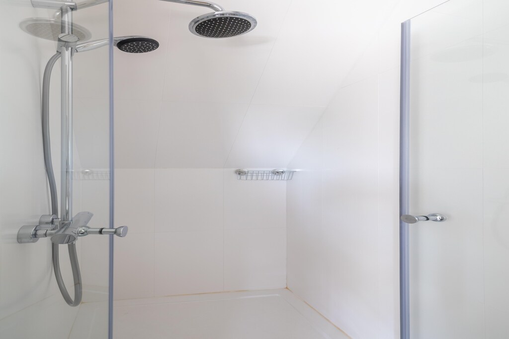 Im ersten Stock finden Sie das Schlafzimmer und das angrenzende Badezimmer. Das Schlafzimmer ist eine Oase der Ruhe mit einem bequemen Doppel-Boxspringbett (160 x 200 cm), einer gemütlichen Sitzecke mit einem Einzelschlafsofa, das für ein Kind geeignet ist, und einem zweiten Fernseher für zusätzliche Unterhaltung. Ein geräumiger Kleiderschrank, Regale und ein Ganzkörperspiegel vervollständigen den Raum, während Nachttischlampen sowohl für funktionale als auch für stimmungsvolle Beleuchtung sorgen.